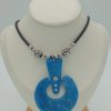 Precioso conjunto de collar en arcilla polimérica con marmolado de color rojo, azul y blanco con abalorios en color dorado en forma de libélula en acero inoxidable y cadena en piel de color negro.