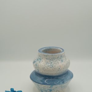 Jarrón barro, azul y blanco. Tamaño en cm; 14 (alto) x 11 (diámetro).