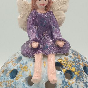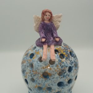Lámpara decorativa realizada a mano con barro blanco, en forma de bola con angelito.