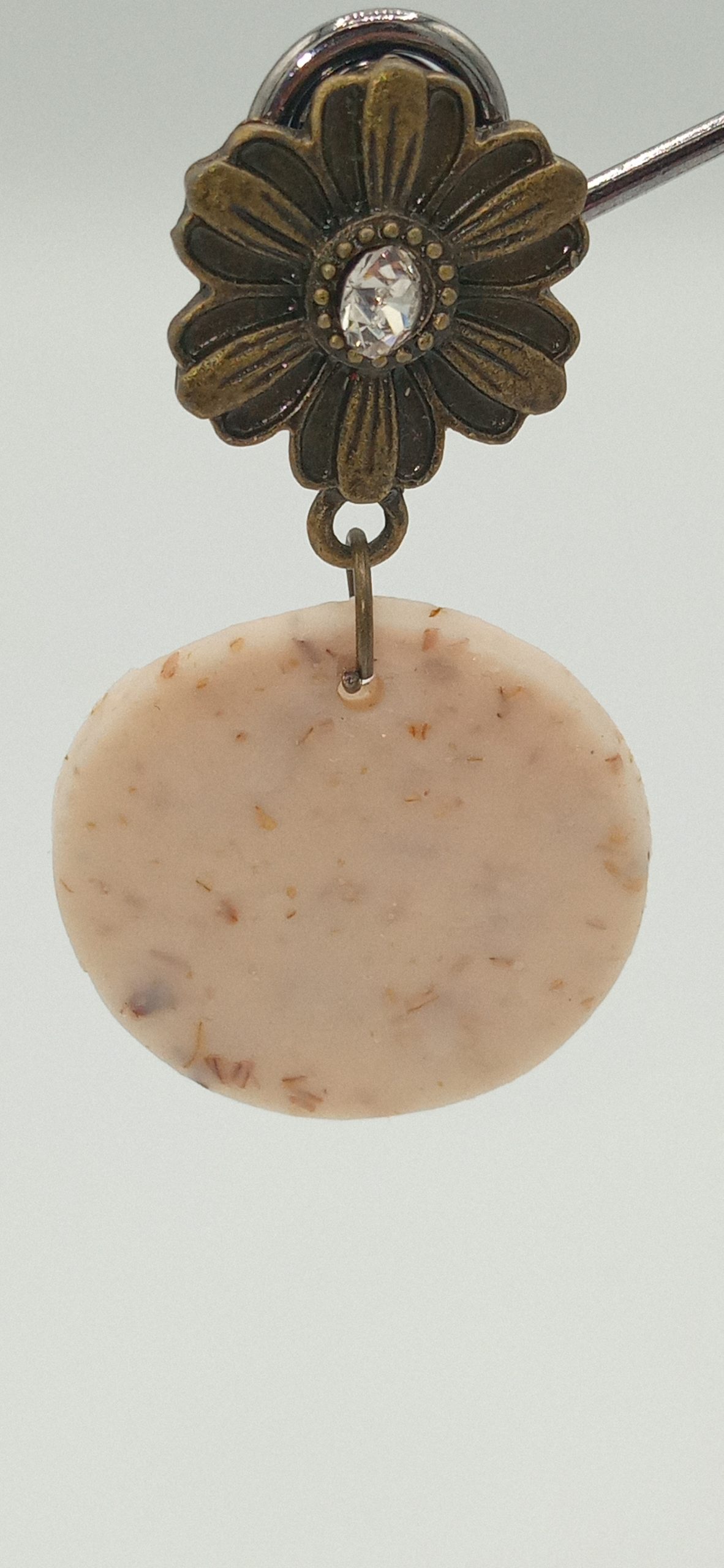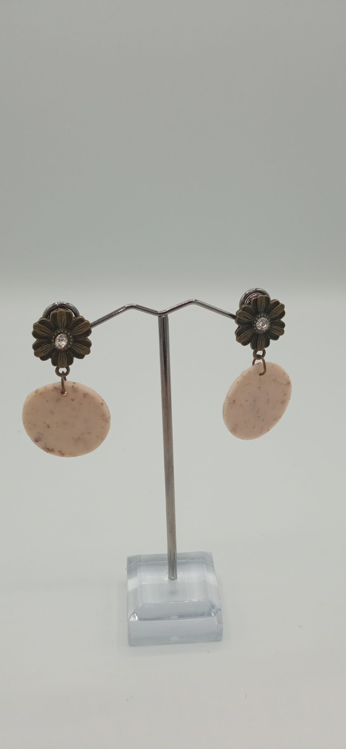 Preciosos pendientes de arcilla realizados a mano. Marmolado nacar, con toques dorados. Avalorio en forma de flor de color bronce. (Acero inoxidable)